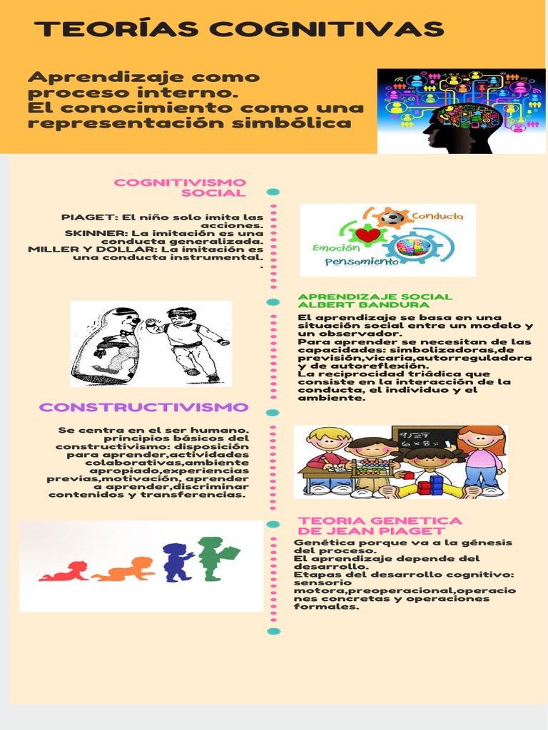 La teoría cognitiva Definición. Teorías Cognitivas del Aprendizaje Introducción A partir de los años 70 el foco de la psicología comenzó a cambiar desde un enfoque conductista a una orientación cognitiva. Las teorías cognitivas en el aprendizaje se basan en gran parte del trabajo de Piaget en los estudios de comportamiento. Basada en los procesos mediante los cuales el hombre adquiere los conocimientos. La Teoría Cognitiva del Aprendizaje explica por qué el cerebro constituye la red más increíble de procesamiento e interpretación de la información en el cuerpo a medida que aprendemos cosas. Elaboración de diversas teorías cognitivas del aprendizaje y sus nuevos enfoques de sus representantes. Teorias cognitivas del aprendizaje en su novena edición es un libro producido por JI. La teoría cognitiva del conocimiento es el conjunto de planteamientos teórico-prácticos que estudian y pretenden explicar los procesos internos que determinan el aprendizajeSe ocupa de los fenómenos internos que se dan en el individuo cuando recibe una información y cuando la aprende. Teorias Cognitivas del Aprendizaje en 104 2 comentarios.